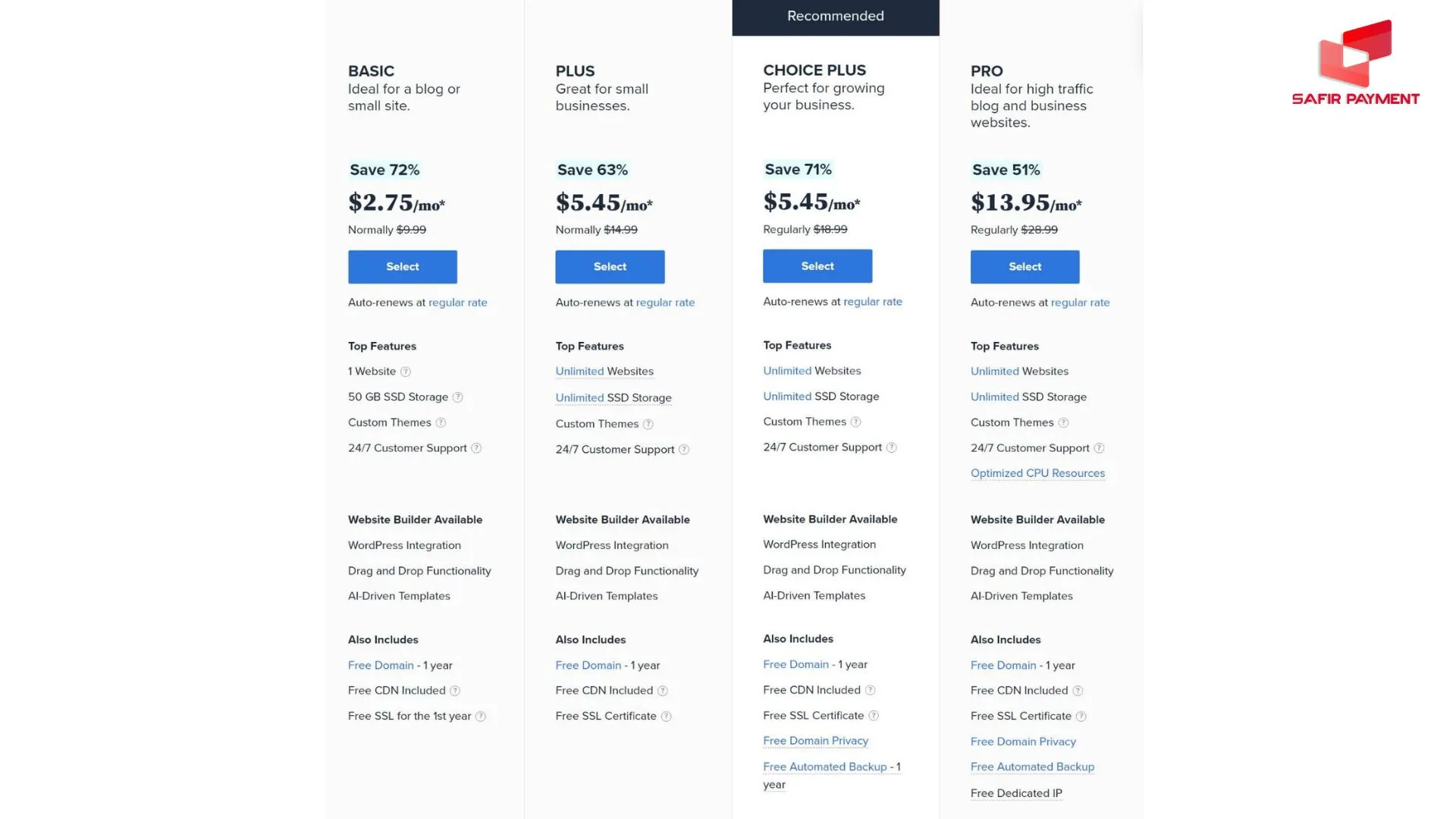 در این مرحله صفحه رسمی پلنهای بلوهاست را مشاهده می کنید که پلنهای مختلف هاست مثل “Basic”، “Plus” و “Choice Plus” در آن وجود دارد. هر پلن امکانات و قیمت متفاوتی دارد تا کاربران بتوانند بر اساس نیاز خود انتخاب کنند. اگر سایت شما تازه راهاندازی میشود یا ترافیک بالایی ندارد، پلنهای اشتراکی گزینه مناسبتری هستند. “پلن Basic” برای یک سایت ساده کافی است و پلنهای بالاتر برای زمانی مناسباند که به فضای بیشتر یا مدیریت چند سایت نیاز دارید.