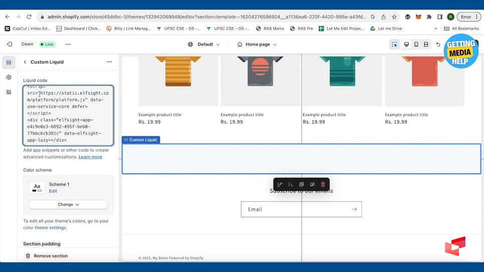 حال در سمت چپ در قسمت “liquid code” کد کپی کرده از elfsight را وارد نمایید.