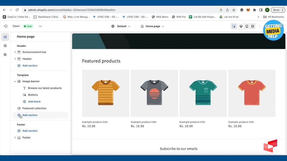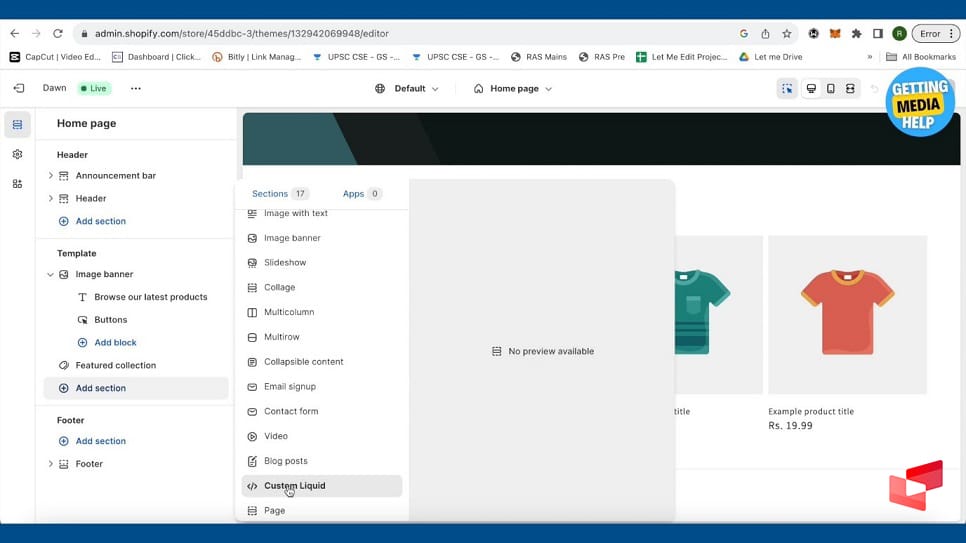 در قسمت تنظیمات سایت، از قسمت Templet دکمه “Add section” را انتخاب کنید. حال به پایین لیست بروید و گزینه “Custom liquid” را بزنید.