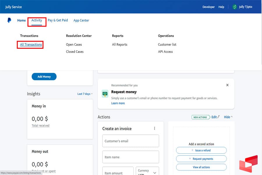 بررسی فاکتورها و ریفاند مبالغ بالا و ناشناس از مهم‌ترین مراحل برای حفظ امنیت استفاده از حساب پی پال در ایران است. برای مشاهده فاکتور تراکنش‌های انجام شده در پی پال کافی است از زبانه “Activity” گزینه “All Transactions” را انتخاب کنید.