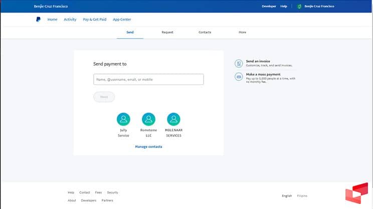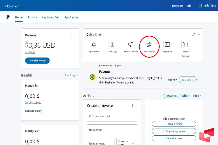 ارسال پول با پی پال از مهم‌ترین موارد آموزش کار با پی پال است. برای ارسال پول به حساب‌های پی پال از قسمت “Quick links” گزینه “Send money” را انتخاب کنید.