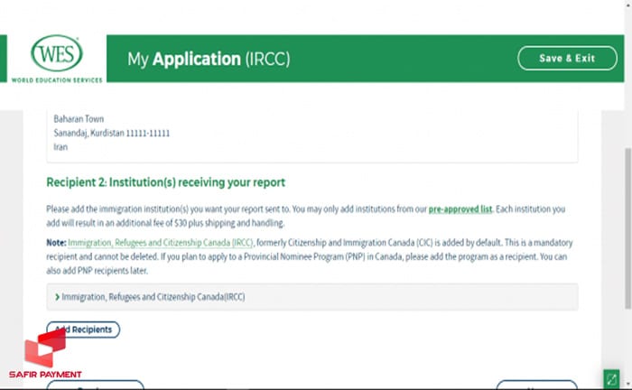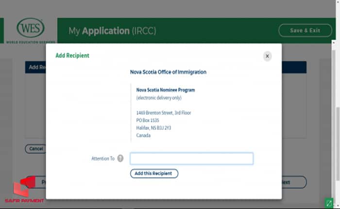 در مرحله بعدی علاوه بر اینکه می‌توانید آدرسی را که ابتدا وارد کرده‌اید، مجددا بررسی کنید، می‌توانید درخواست خود را برای ارسال یک نسخه از مدرک به محل و شخص خاص دیگری در کانادا ثبت کنید. برای انجام این کار، روی گزینه Add Recipients بزنید. در تصویر آدرس پیش‌فرضی از امور مهاجرتی استان نوا اسکوشیا درج شده است.